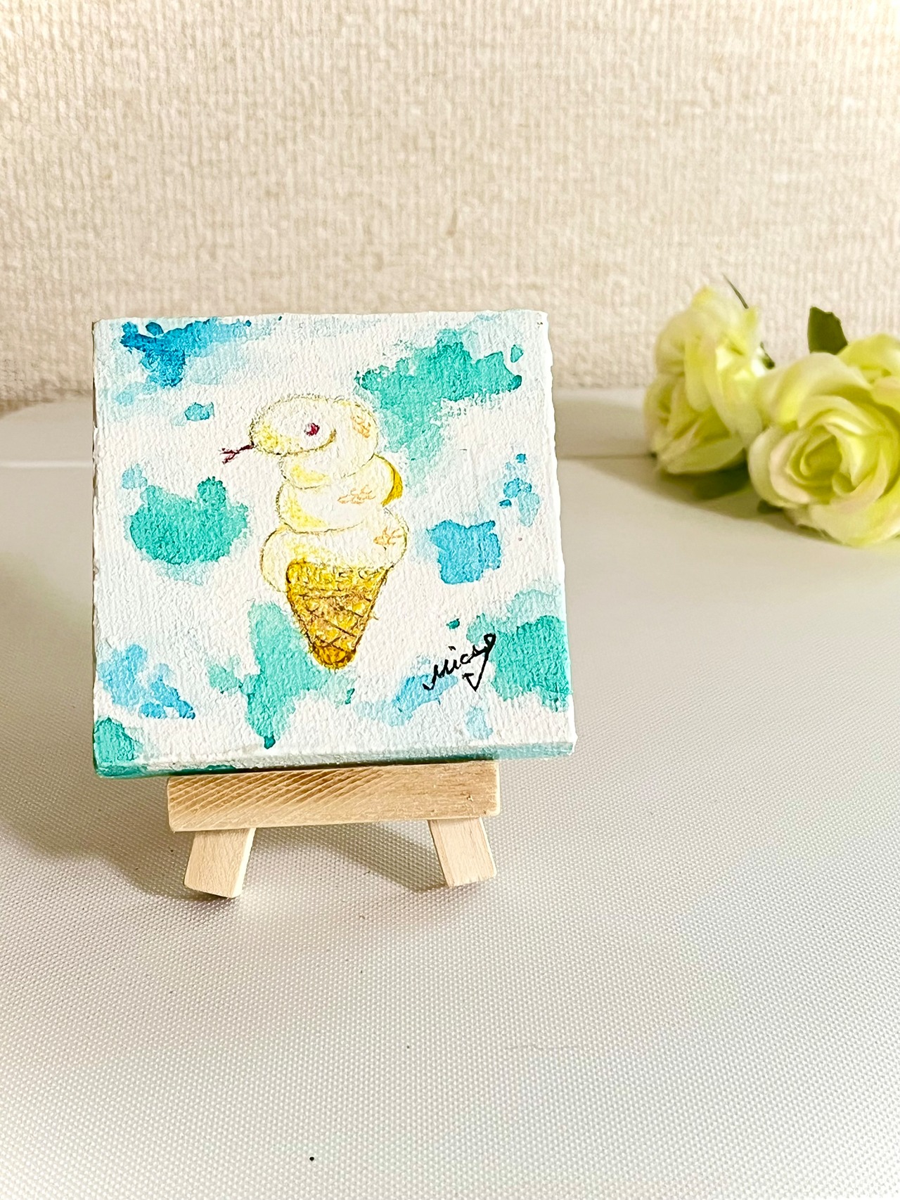 7㎝角のミニキャンバスに水彩絵の具とパステルを使用したイラストです、